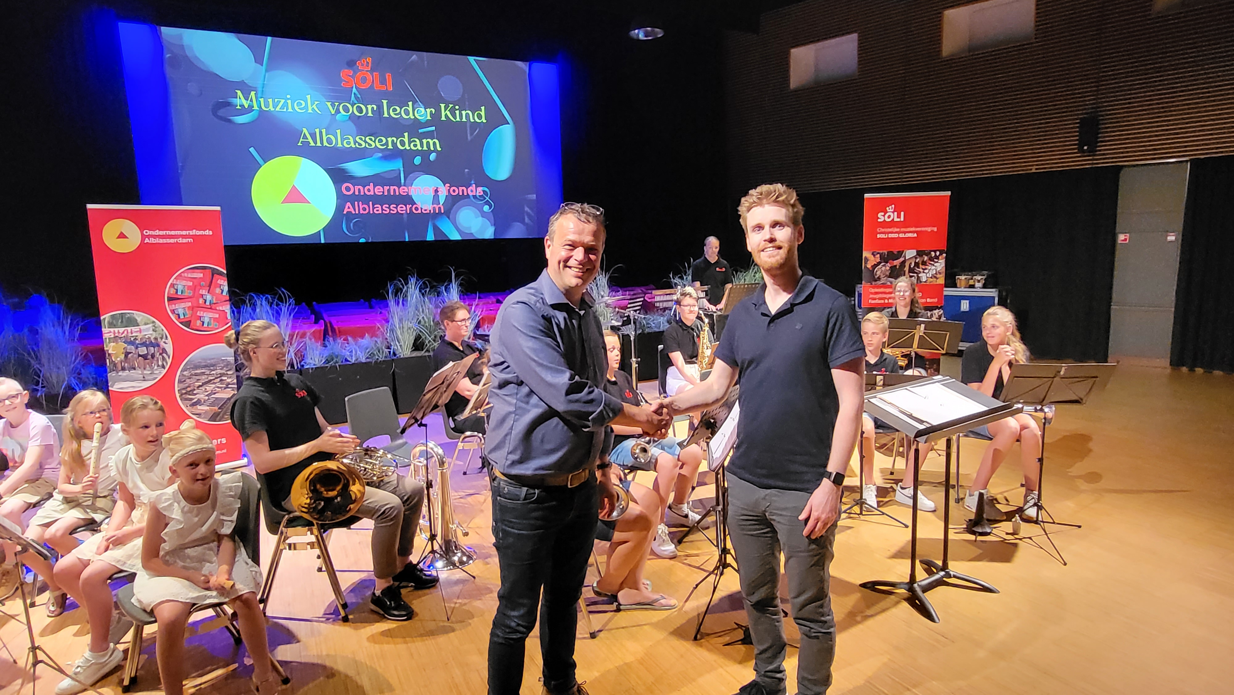 De support van Ondernemersfonds Alblasserdam aan muziekvereniging Soli Deo Gloria werd afgelopen dinsdag bekrachtigd door secretaris Edwin Struis van OFA en voorzitter Joël van Driel van Soli. Omringd door de muzikanten van Soli’s opleidingsorkest Solide en de deelnemers aan de cursus Muziek=Leuk die onlangs op de Beukelmanschool werd gehouden schudden ze elkaar de hand. Voor de kinderen van Muziek=Leuk was het een extra bijzondere avond, want ze traden voor het eerst op én kregen hun eerste muziekdiploma.